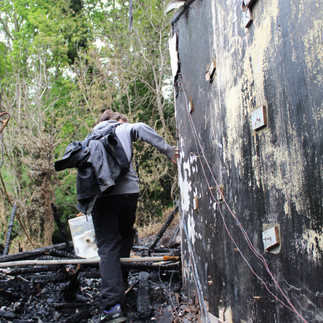 Scrambling through the wet wooded area, that we were once so excited to explore, we were greeted with the sight of charred, black wood that stunk of fire from a mile away.